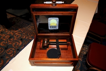 The box is made from 19th century Honduran mahogany with over 100 separate hand made parts. The top features the rising sun of EAST inlaid with burled elm on a background of Cuban mahogany framed in a rectangular band of holly. The sides of the box feature hand crafted raised panels. The cover of the box is attached with geometric gold plated stop hinges from the 1860’s. So that the gavel may be displayed with the cover open, an engraved sterling silver plate with the EAST insignia and the words, “The Presidential Gavel”, was applied to the inside cover and an internal glass dust cover was hinged into the box in a hand-crafted frame. Even the inside cover of the frame for the glass has original detailed beveled molding to hold it in place. The gavel and sound block sit in felt covered custom cradles. No traditional stains were used in the development of the piece but rather a series of acid washes applied in such a fashion that the darkness and richness of the wood is maximized. The finish is in simple shellac.