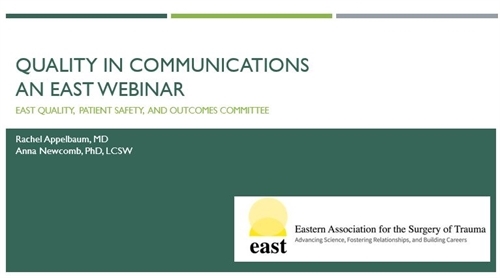 ICYMI - The EAST Quality in Communications - What, Why and How Webinar sponsored by the EAST Quality, Patient Safety and Outcomes Committee was held on August 11, 2020. Watch the Webinar