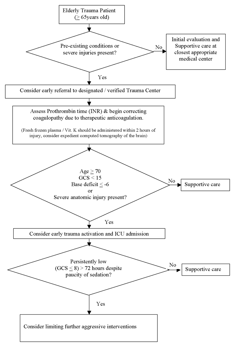 Elderly trauma patients face an increased risk for adverse outcomes after injury. As such, clinicians treating injured patients of advanced age need guidance in identifying the techniques and practices that have the proven capacity to improve outcomes. The original geriatric practice management guidelines (PMG) produced by this group (2001) addressed age-related triage criteria, resuscitation guidelines, and expectations for outcomes.[1] In the decade that has passed since its compilation, it could be argued that our understanding of these matters has not substantially changed except in the areas of supra-physiologic resuscitation, correction of medication-induced coagulopathy, and aggressiveness of initial assessment of the elderly injured patient. The recommendations promulgated by the original version of this practice management guideline not contradicted by subsequent literature have been retained within the structure of this update.