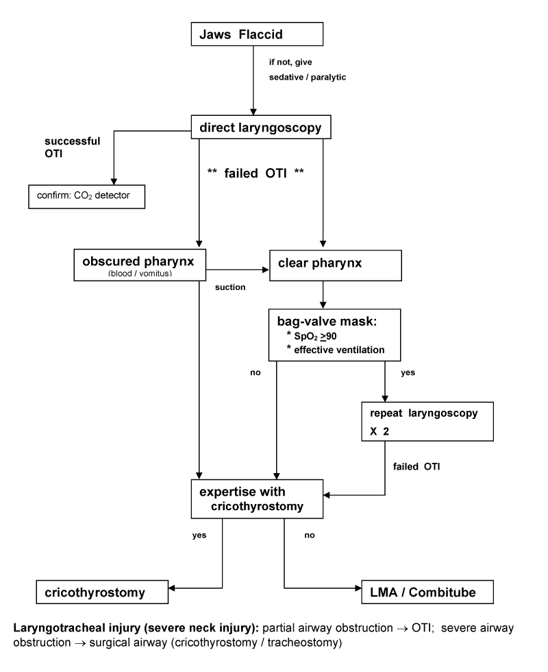 - tracheal intubation procedures (orotracheal intubation, drug-assisted orotracheal intubation, nasotracheal intubation, fiberoptic-assisted tracheal intubation, cricothyrostomy, emergency tracheostomy, esophageal-tracheal Combitube insertion, and laryngeal mask airway insertion):