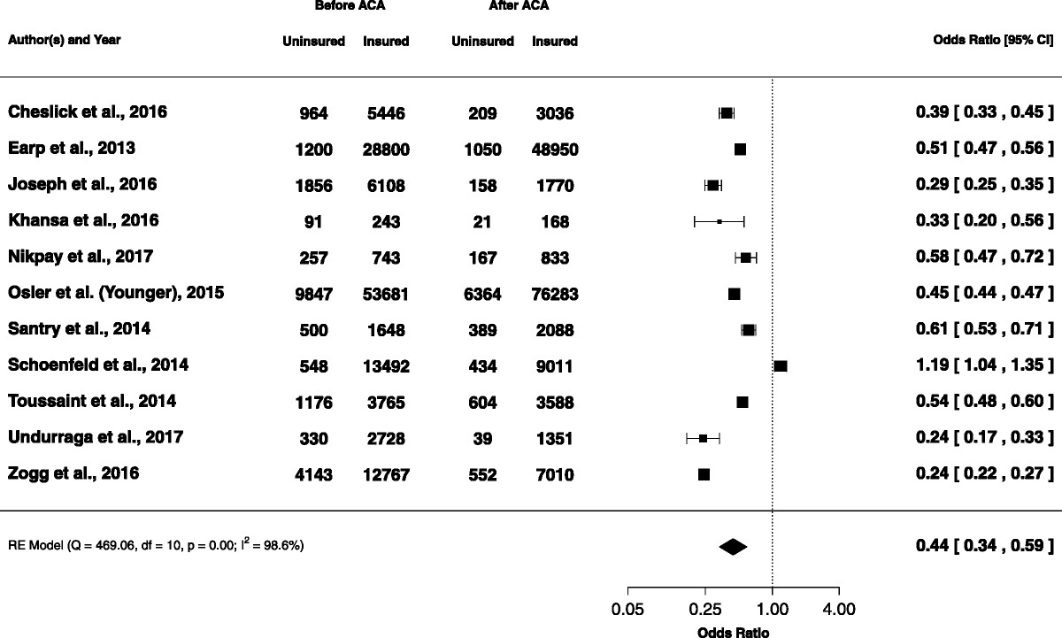 For trauma patients, ME and MHR led to large gains in insurance coverage, with many studies demonstrating a decrease of nearly 50% in uninsured rate. Though prior data suggest a strong association between lack of insurance and increased mortality for trauma patients, these ME/MHR-related gains in coverage were not associated with a consistent or significant reduction in inpatient mortality in our meta-analysis. The inpatient mortality odds ratio of 0.96 (Fig. 2) should be interpreted in light of the 95% CI that effectively excludes a reduction in mortality greater than 12% and an increase in mortality greater than 5%. Available data cannot rule out smaller mortality changes which could still be clinically meaningful. It is also possible that increased insurance coverage may lead to a delayed, but not immediate, improvement in clinical outcomes as increased reimbursement may lead to a better financial situation for the hospital and subsequent investments in quality improvement. Finally, it is possible that the well-described association between insurance status and inpatient trauma mortality is a not directly causal, but rather points to a complex interplay of host, prehospital, hospital, or provider factors across the continuum of trauma care.[2]