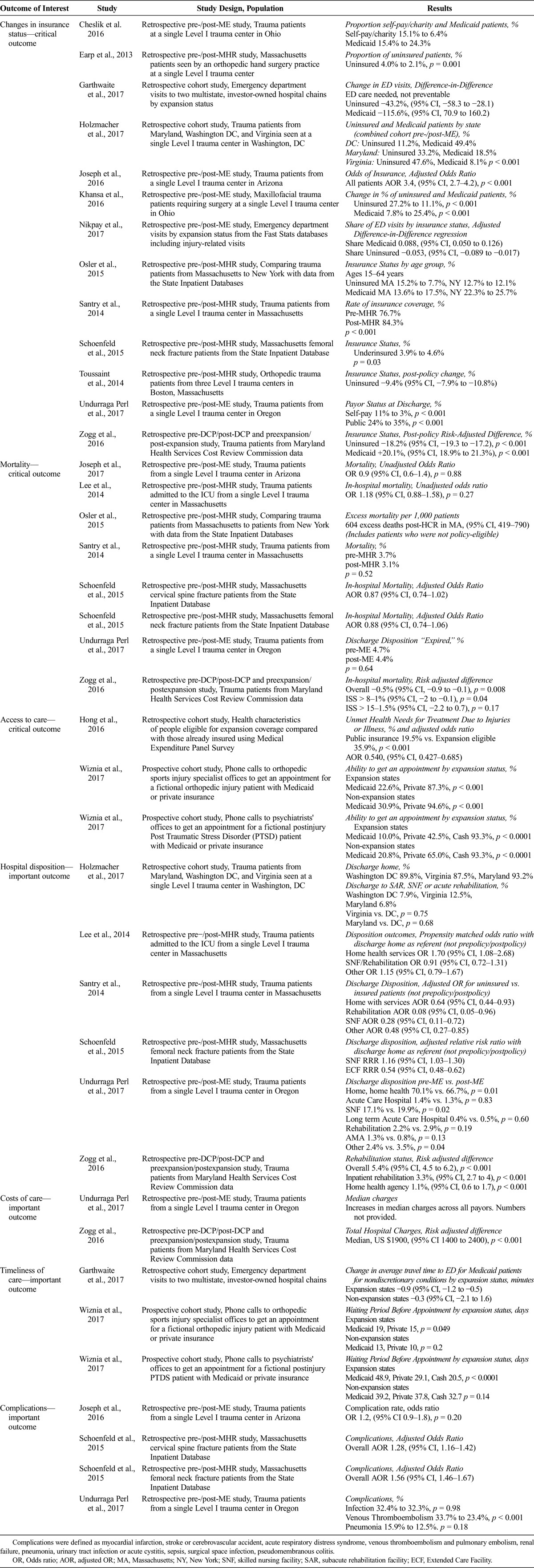 RESULTS From 4,593 citations, we found 18 studies addressing all seven predefined outcomes of interest for trauma patients, three studies addressing six of seven outcomes for EGS patients, and three studies addressing three of eight outcomes for trauma systems. On meta-analysis, trauma patients were less likely to be uninsured after ME or MHR (odds ratio, 0.49; 95% confidence interval, 0.37–0.66). These coverage expansion policies were not associated with a change in the odds of inpatient mortality for trauma (odds ratio, 0.96; 95% confidence interval, 0.88–1.05). Emergency general surgery patients also experienced a significant insurance coverage gains and no change in inpatient mortality. Insurance expansion was often associated with increased access to postacute care at discharge. The evidence for trauma systems was heterogeneous.