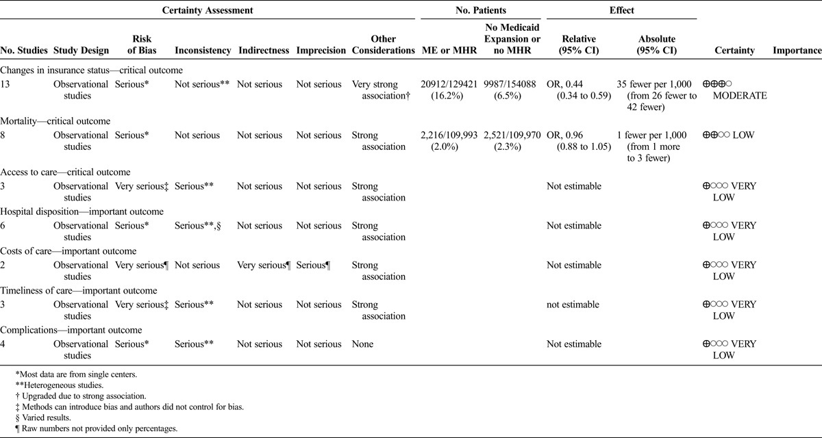 These findings must be interpreted in light of the study's limitation. First, this systematic review is only a snapshot of the evidence in a quickly evolving field. Medicaid expansion is still a relatively new policy and continues to evolve, thus ongoing analysis will be critically important to evaluate the effects of these policies as more data continues to become available. Second, while we attempted to assemble a writing group from broad political positions and from ME and nonexpansion states, our study is still subject to bias as ME and the ACA remains a controversial topic. However, we aimed to mitigate this potential bias by adhering to the GRADE methodology. Finally, we focused our review on insurance expansion efforts from the 2006 MHR and the 2010 ACA ME policy; however, there are additional insurance expansion efforts that may have a significant impact on trauma and EGS care in the United States. For example, the 2008 Oregon Medicaid health experiment and the 2010 Dependent Coverage Provision have shown that these expansion efforts have impacted access to care, use of preventative health services, improved self-reported health and improved financial security among patients, which may translate into benefits to trauma and EGS patients that were not captured in this systematic review.[37][40][41]