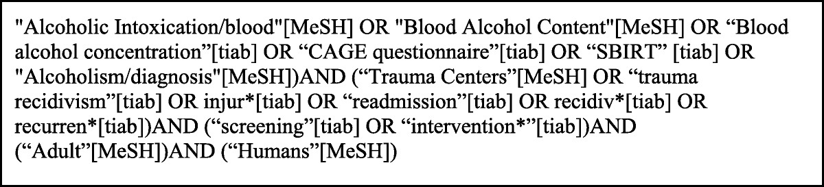 A research librarian aided our systematic search of PubMed, MEDLINE, and the Cochrane Library. After preliminary queries, we chose to apply the following Medical Subject Headings (MeSH) terms: alcoholic intoxication/blood, blood alcohol content, alcoholism/diagnosis, trauma centers, adult, and humans, along with the following title and abstract terms: blood alcohol concentration, CAGE questionnaire, SBIRT, trauma recidivism, injury/injuries, readmission, recidivism/recidivist, recurrent/recurrences, screening, and intervention. Figure 1 contains the string used for the initial search. This systematic search was completed in October 2018. In addition to the electronic search, manual review of bibliographies of articles was led by the lead author (L.M.K.). Four additional studies were identified for inclusion in November 2018 after manual review. In total, 148 abstracts, published between 1986 and 2017, were identified for review.