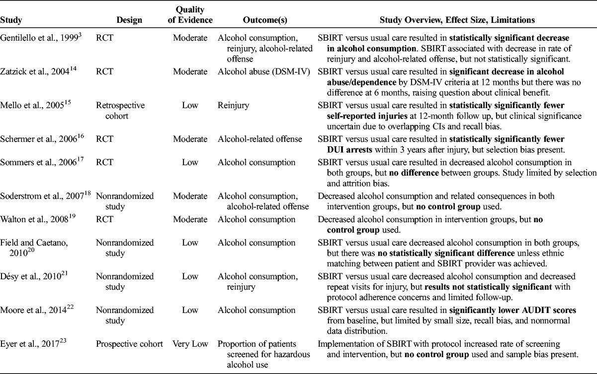 Table 1. Summary of Evidence for Preventive Efficacy of Alcohol Screening, Brief Intervention, and Referral to Treatment for Injured Patients With Alcohol Use Disorders Seen in the ED, Trauma Center, or Hospital Setting.