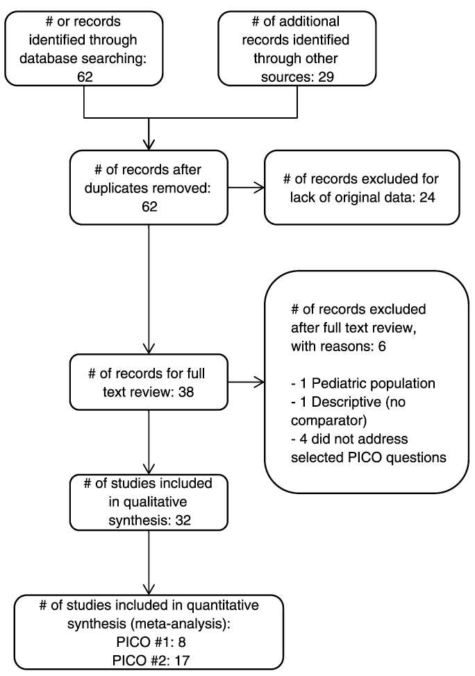 The original search yielded 62 studies; after the elimination of studies that did not contain the original data, only 38 were deemed appropriate for full-text review. We further excluded six studies: one excluded study included a pediatric population, another was descriptive in nature, and four did not address the specific questions outlined in our review. We ultimately included 32 studies in this guideline for recommendations.[3–5][9–11][31–56] Of these articles, there were no randomized trials; two were prospective studies,[4][5][11][31–37][56] while the remaining were retrospective (Table 1). Note that in this table, some studies included the total number of patients with CDI as well as those patients who had CDAD that required intervention, while others included only patients with CDAD. As outlined in the PRISMA diagram in Figure 1, we included all 32 studies in the qualitative synthesis. We then identified eight studies that were appropriate for quantitative synthesis (meta-analysis) for PICO Question 1, and 17 studies for PICO Question 2.