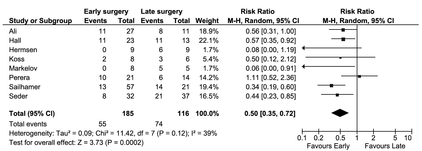 Before pooling study data, we assessed methodological and clinical heterogeneity across the studies and found variability in how the intervention and comparator were defined. The most commonly defined measure of early versus late surgery was progression to the need for vasopressors. With the use of this definition, eight studies were included in the meta-analysis. We found that early surgery was associated with reduced mortality rates with an RR of 0.50 (95% CI, 0.35–0.72; Fig. 2). Of note, the I[2] statistic was 39%, falling into the “low” heterogeneity category, indicating that the studies were comparable.