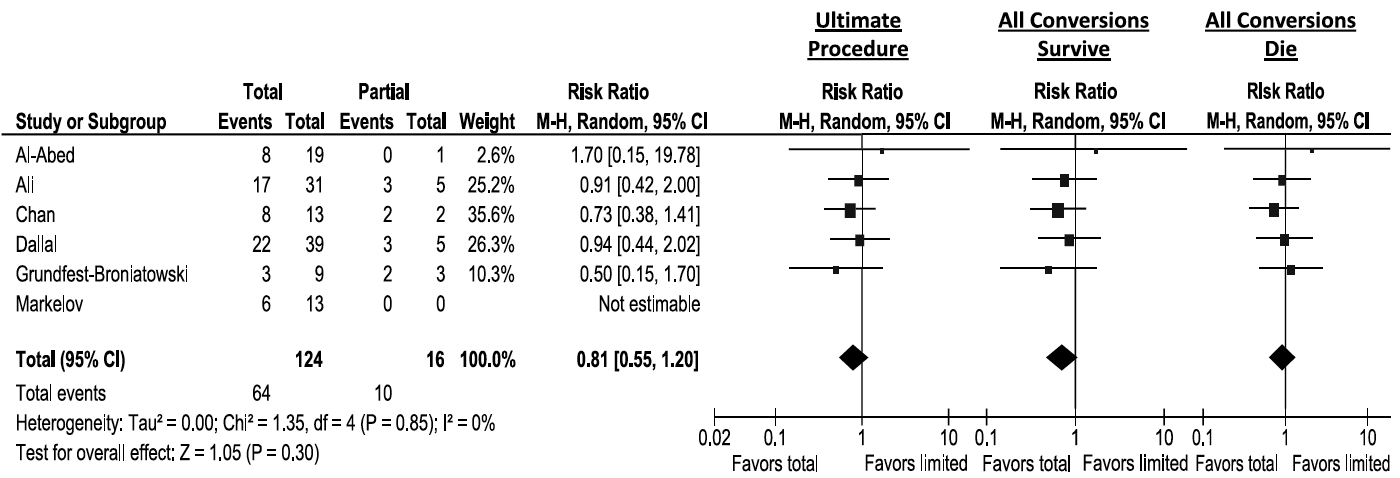 In our meta-analysis, we considered that having multiple operations constituted a treatment failure at initial operation, such that the ultimate operation performed would have significant impact. When we explored this, we did indeed find that our effect estimate shifted to the other side, in favor of total colectomy. Although the null hypothesis is still included, the magnitude of the effect is a nearly 15% reduction in mortality, and that the effect changes direction is compelling. On subgroup analysis of the studies specifically reporting conversions from limited procedures to total colectomy, we find similar estimates, with sensitivity analysis considering best- and worst-case scenarios for mortality after conversion, maintaining a point estimate in favor of total colectomy.