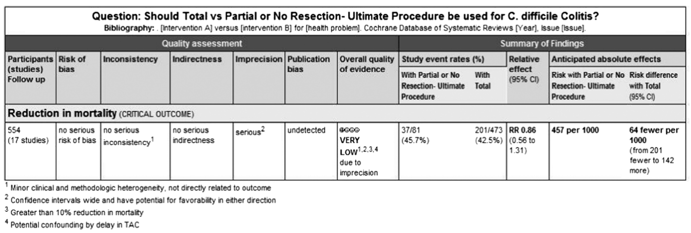 Figure 6. Ultimate procedure, total colectomy versus partial or no resection, evidence profile.