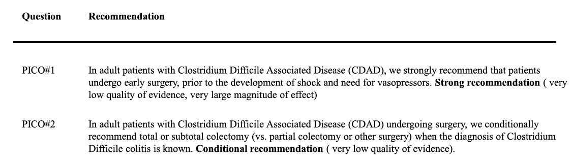 RECOMMENDATION: In adult patients with CDAD, we strongly recommend that patients undergo surgery early, that is, before the development of shock or the need for vasopressors. This recommendation is based on very low quality evidence but considers that individual patients will place a high value on the overall benefit (reduced mortality rates).
