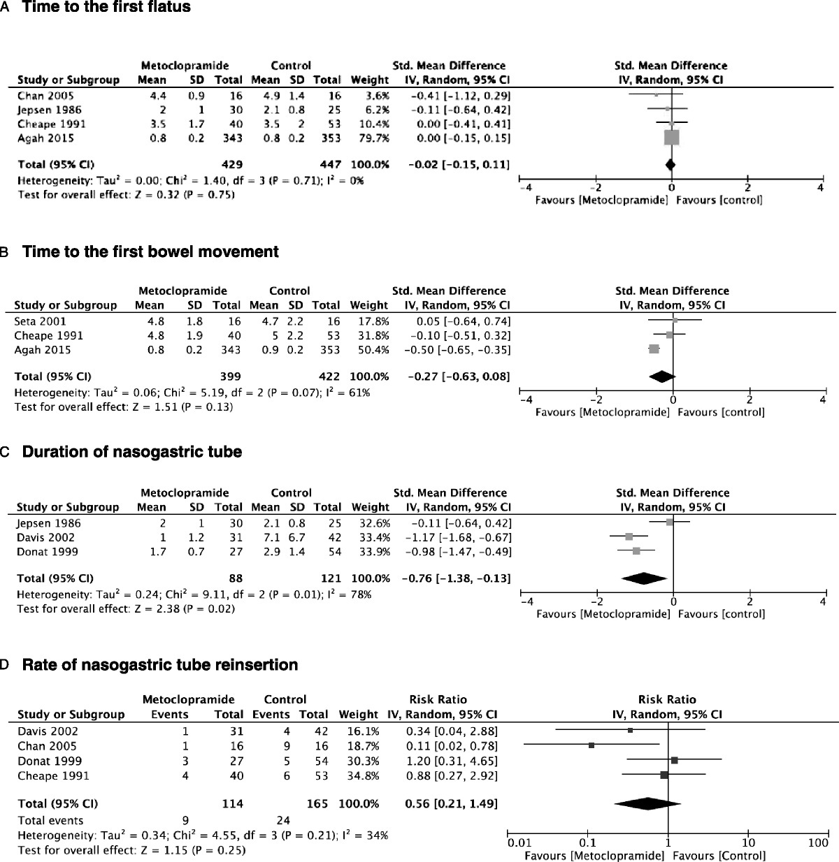 Seven out of the eight studies were suitable for meta-analysis. There was a beneficial effect of metoclopramide on the duration of NGT (SMD, −0.76; 95% CI, −1.38 to −0.13), the rate of NGT reinsertion (RR, 0.56; 95% CI, 0.21–1.49), and hospital LOS (SMD, −0.42; 95% CI, −0.72 to −0.12) (Fig. 2C, 2D, 2F).