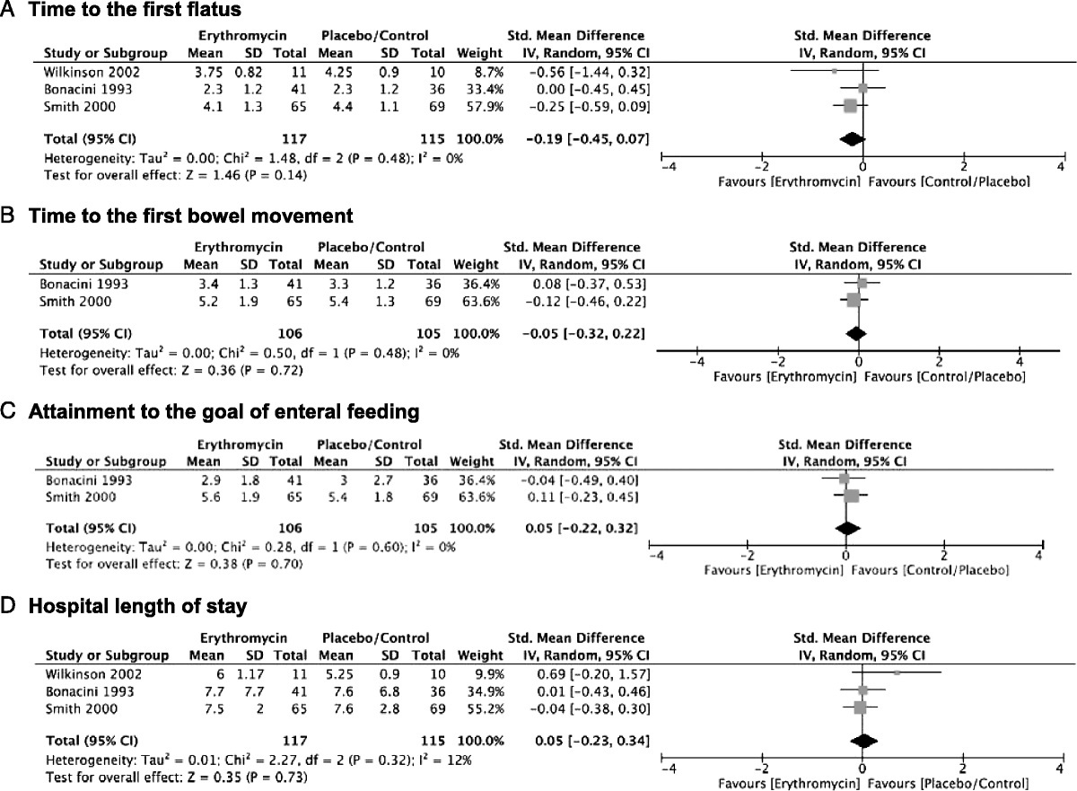 Figure 3. Erythromycin. A, Time to the first flatus. B, Time to the first bowel movement. C, Attainment to the goal of enteral feeding. D. Hospital LOS.