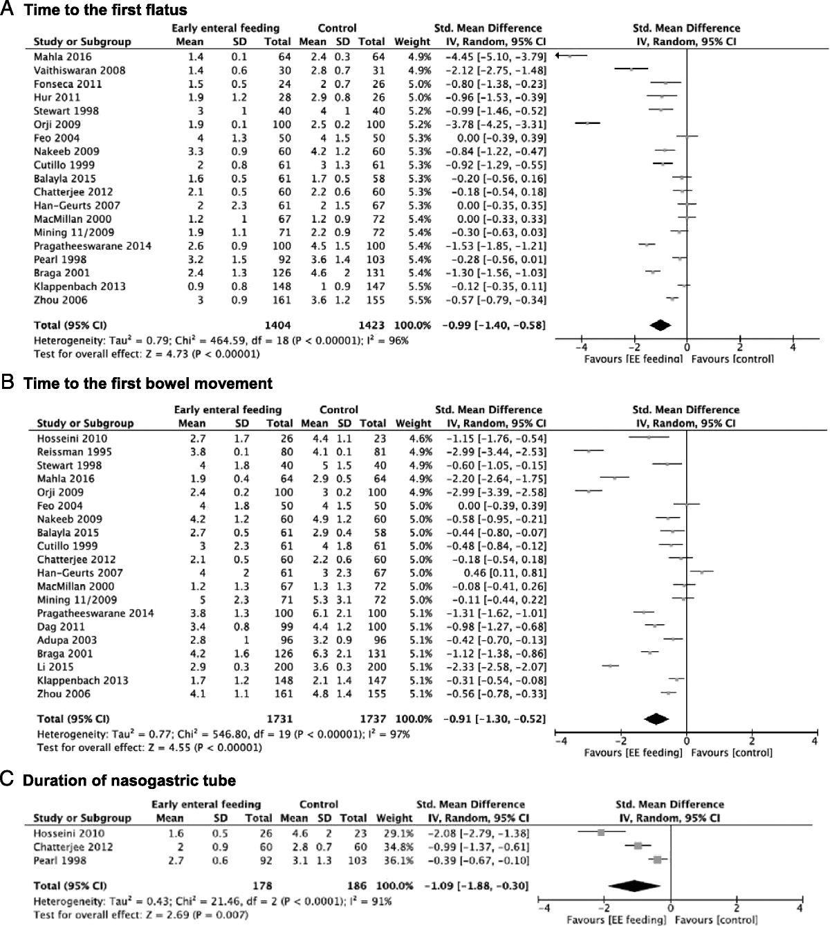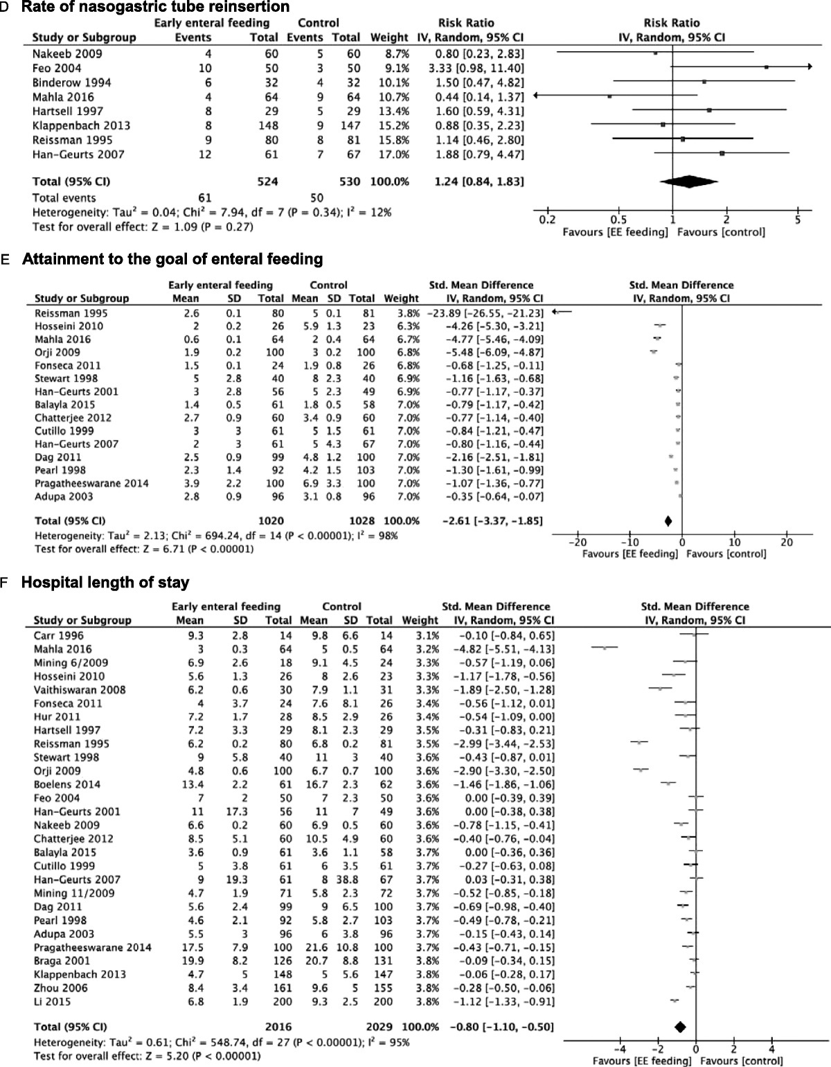 All studies were included in the meta-analysis. EEN was associated with faster return of normal bowel function, defined as: time to first flatus (SMD, −0.99; 95% CI, −1.40 to −0.58), time to first bowel movement (SMD, −0.91; 95% CI, −1.30 to −0.52), duration of NGT (SMD, −1.09; 95% CI, −1.88 to −0.30), NGT reinsertion rate (RR, 1.24; 95% CI, 0.84–1.83); attainment of enteral feeding goal (SMD, −2.61; 95% CI, −3.37 to −1.85), and hospital LOS (SMD, −0.80; 95% CI, −1.10 to −0.50) (Fig. 4).