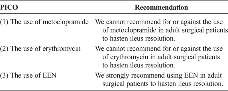 For the use of metoclopramide in adult surgical patients to hasten ileus resolution, we cannot recommend for or against. We cannot recommend for or against the use of erythromycin in adult surgical patients to hasten ileus resolution. We strongly recommend using EEN in adult surgical patients to hasten ileus resolution (Table 4).